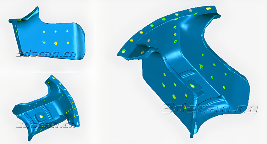 华朗三维工程师使用三维扫描仪HL-3DS从不同的角度和位置扫描汽车尾门,获取汽车尾门的三维数据后和原有的数据进行对比检测,即可得出非常直观的三维检测色谱图。根据比对报告,可以很清晰地看到实际生产的尾门与CAD图纸的整体偏差,清晰知晓工件的质量,如哪个位置有突起或者凹进。