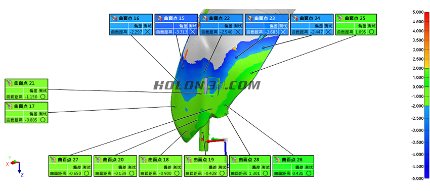 根据客户要求以及扫描样件,我司技术工程师采用手持三维扫描仪A22对搅拌叶片进行全面三维扫描,三维扫描仪自动定位目标点,快速采集高精度点云数据。将采集数据导入三维检测软件并对根部各个曲面点进行数据分析,查看曲面距离偏差值符合程度。可导出简而易懂数据报告供客户进行对比参考,了解存在问题点。能帮助客户快速呈现问题,提供解决方案参考数据。